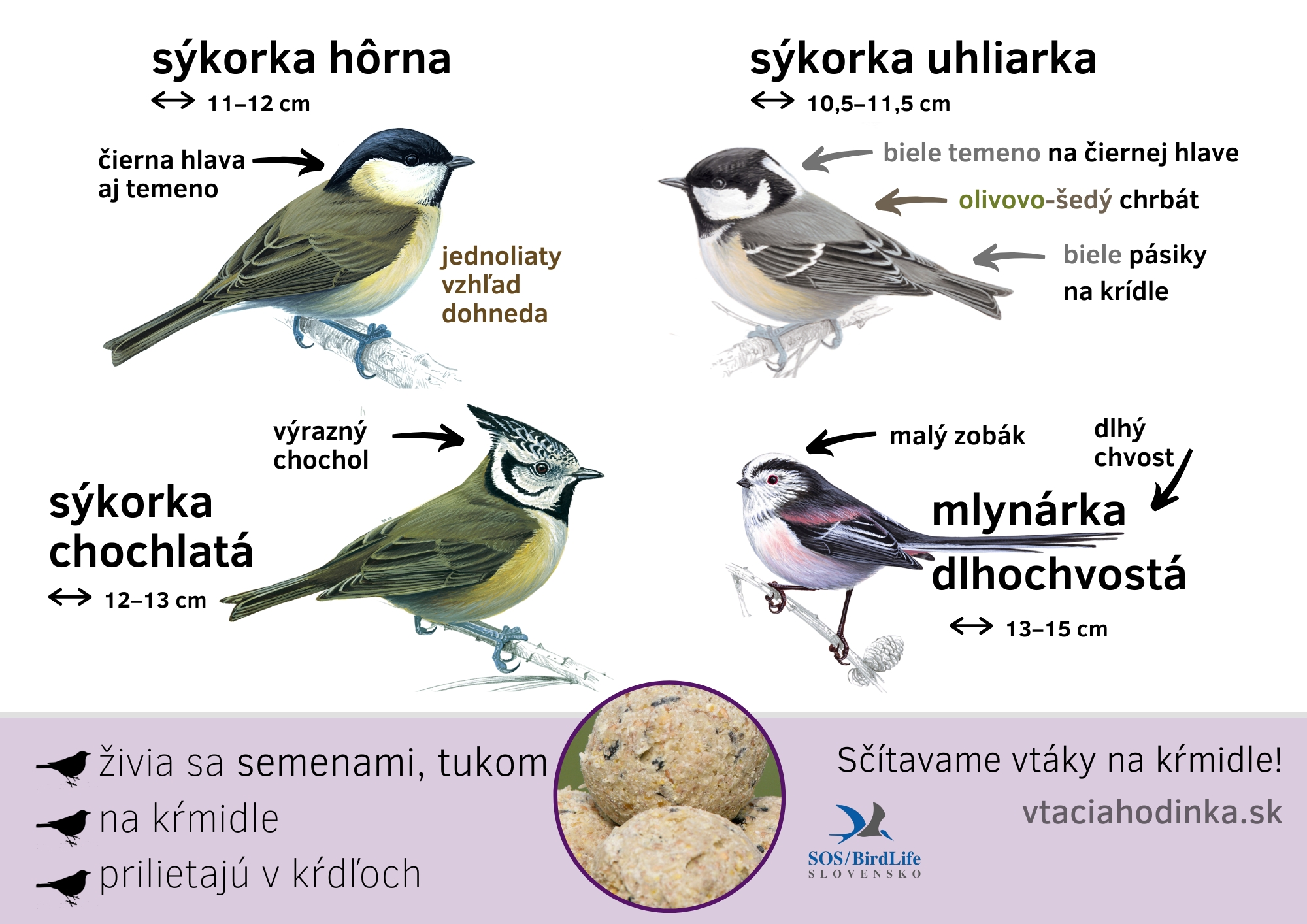 Sýkorke hôrnej je takmer na nerozoznanie podobná sýkorka čienohlavá. Ako si s nimi poradiť prezradí odsek „tvrdé oriešky“.